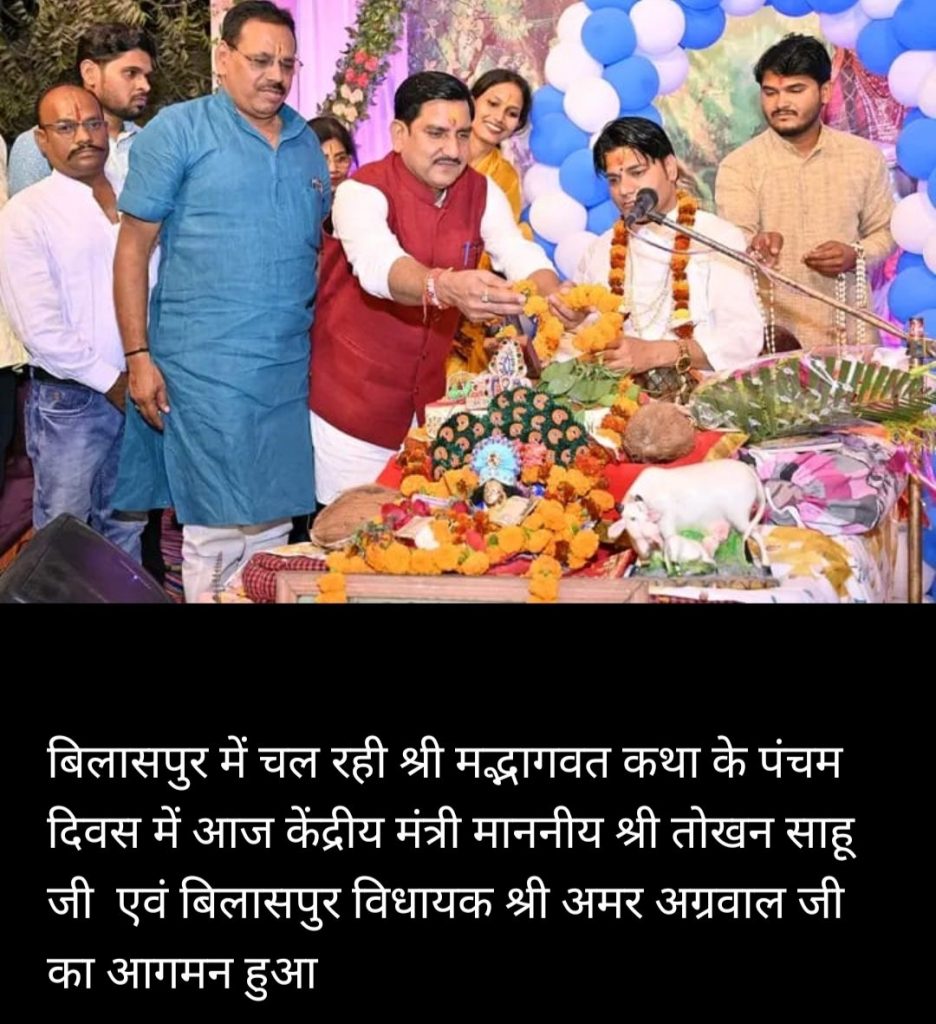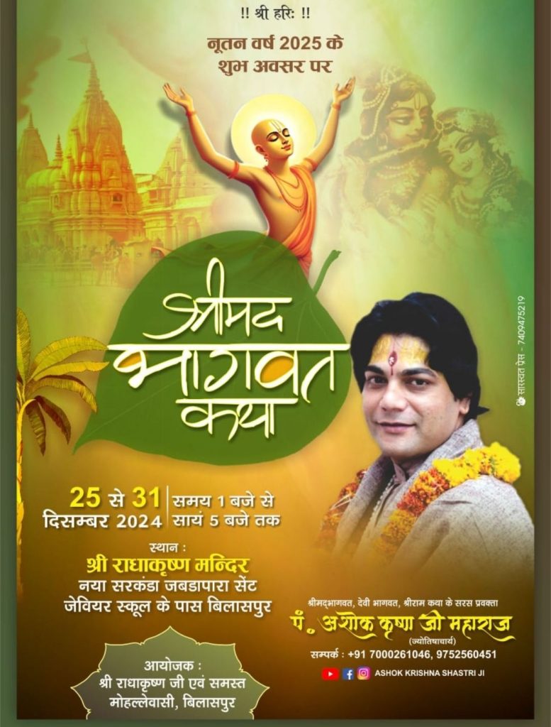 ***बिलासपुर ग्लोबल न्यूज ब्यूरो धार्मिक समाचार***बिलासपुर जबडापारा में श्रीमद् भागवत सप्ताह भक्ति ज्ञान यज्ञ सामूहिक भागवत कथा का आयोजन श्री राधा कृष्ण मंदिर एवं मोहल्ले वासियों के द्वारा 25 दिसंबर से 31 दिसंबर तक बिलासपुर के भक्तगणों के द्वारा किया गया वृंदावन से पधारे पंडित अशोक कृष्ण शास्त्री के द्वारा श्रीमद् भागवत कथा का रसपान कराया जा रहा है इसी कड़ी में सुखदेव जन्म परीक्षित जन्म प्रहलाद चरित्र श्री राम अवतार कृष्ण अवतार माखन चोरी की लीला गोवर्धन पूजन लीला रुक्मणी मंगल विवाह सुदामा चरित्र और फूलों की होली का आयोजन किया गया जिसमें भगवान की अद्भुत लीलाएं का वर्णन किया गया एवं पंडित अशोक कृष्ण शास्त्री के द्वारा बताया गया कि प्रत्येक व्यक्ति को एकादशी का व्रत अवश्य रखना चाहिए एकादशी के व्रत के दिन चावल का भोग एवं चावल का दर्शन भी नहीं करना चाहिए एवं उड़ीसा के जगन्नाथ मंदिर में चावल का भोग का वर्णन पंडितअशोक कृष्ण शास्त्री के द्वारा किया गया एवं मां कर्मा की कथा का भी लोगों को रसापान वृंदावन से पधारे पंडितअशोक कृष्ण शास्त्री के द्वारा बताया गया। श्री राधे