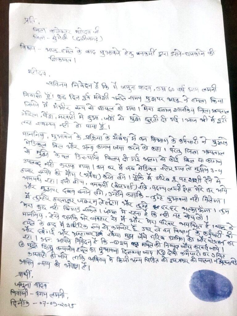 *भालू हमले से घायल बुज़ुर्ग जमुना यादव मुआवज़े के लिए भटक रहे थे, अख़बार में ख़बर छपी तो वनकर्मी ने दी धमकी – अब कलेक्टर से गुहार*