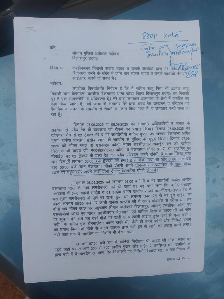 बेलगहना । क्षेत्र में लगातार हो रहे अवैध उत्खनन को लेकर रोकथाम हेतु अभियान चला रहे समाजसेवी सचिन साहू के खिलाफ ग्राम करहिकछार के संजय यादव ने गुंडागर्दी एवं अवैध वसूली का आरोप लगाते हुए कलेक्टर व पुलिस अधीक्षक बिलासपुर को शिकायत पत्र प्रेषित कर कार्रवाई की मांग की थी जिसमें अभिवहन पास को छीनकर फाड़ने का भी आरोप लगाया गया है। मीडिया के माध्यम से जानकारी मिलने व शिकायत पत्र की प्रतिलिपि मिलने पर साहू ने गुरुवार को बिलासपुर मुख्यालय पहुंचकर कलेक्टर व एसपी से मुलाकात कर अपना पक्ष रखते हुए बताया है कि रेत माफिया द्वारा लगाया गया आरोप निराधार व बेबुनियाद है।उन्होंने अधिकारियों से कहा है कि अवैध रेत के मामले में उनके द्वारा सबसे पहले कलेक्टर, एसडीएम व खनिज विभाग को अवगत कराने के बाद रोकथाम हेतु कदम बढ़ाया जाता है तथा जिन दो ट्रैक्टर को माफिया ने मेरे द्वारा पुलिस थाने लाने की बात कही है वह सरासर झूठी है।उक्त वाहनों को चौकी प्रभारी बेलगहना द्वारा जप्त कर लाया गया था।इसी प्रकार अभिवहन पास फाड़ने के आरोप पर साहू ने कहा कि संजय यादव नामक जिस व्यक्ति ने अभिवहन पास छीनकर फाड़ने का आरोप लगाया है वह रेत माफिया घटना दिवस को वहां था ही नहीं। इस बात की पुष्टि उस क्षेत्र के जनप्रतिनिधियों, ग्राम वासियों व मीडिया कर्मियों से की जा सकती है। साहू ने रेत माफिया द्वारा की गई शिकायत को झूठा बताते हुए स्वयं कलेक्टर व पुलिस अधीक्षक बिलासपुर से मुलाक़ात की है तथा उन्हें आवेदन की प्रति सोपते हुए जांच करने व दोषी पाए जाने पर रेत माफिया के खिलाफ एफ आई आर करने की मांग की है तथा कहां है उक्त रेत माफिया आंदोलन को कुचलने का कुत्सित प्रयास कर रहे हैं जो कभी सफल नहीं होगा और जनता के सहयोग से इस मामले की लड़ाई जारी रहेगी।