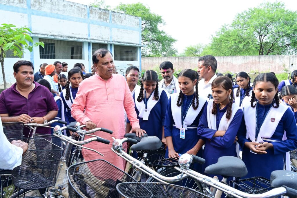 भाटापारा 22 सितंबर/शारदीय नवरात्र के पावन पर्व के प्रथम दिवस पर छत्तीसगढ़ सरकार द्वारा संचालित योजना सरस्वती साइकिल योजना कार्यक्रम के तहत सोमवार को भाटापारा विकासखंड के शासकीय हाई स्कूल गोढ़ी (टी) में पढ़ने वाले नवीं कक्षा के छात्राओं के बीच साइकिल का वितरण वरिष्ठ भाजपा नेता छत्तीसगढ़ शिवरतन शर्मा द्वारा किया गया. साथ ही विद्यालय परिसर में बनने वाले अतरिक्त कक्ष निर्माण कार्य के लिए भूमिपूजन भी किया गया..सर्वप्रथम शिवरतन शर्मा एवं अन्य अतिथियों द्वारा संयुक्त रूप से दीप प्रज्ज्वलित कर कार्यक्रम का शुभारंभ किया गया. इस अवसर पर शिवरतन शर्मा ने उपस्थित छात्राओं के साथ अभिभावक को संबोधित करते हुए नवरात्र पर्व की बधाई दी और कार्यक्रम को सम्बोधित करते हुए कहा कि भारतीय जनता पार्टी की सरकार में विकास की गंगा सदैव बह रही है. लगातार क्षेत्रवासियों को सीधे तौर पर लाभ देने का काम भाजपा की सरकार द्वारा ही किया गया है. साइकिल मिलने से सुदूर ग्रामीण क्षेत्रों में पढ़ने वाले छात्राओं को अब आने-जाने में कोई परेशानी नहीं उठानी होगी. बच्चे मन लगाकर पढ़ें, यही सरकार की सोच है. इससे बच्चे उत्साहित होंगे तथा शिक्षण कार्य में सुधार होगा. ड्रॉप आउट बच्चों की संख्या में कमी आएगी एवं नियमित रूप से विद्यालय आने को प्रेरित होंगे. शिवरतन शर्मा ने आगे कहा कि शासन आपकी हर जरुरत के हिसाब से अपनी सोच बना कर काम कर रही है, हमारी सरकार चाहती है कि बेटियां पढ़ लिख कर आगे बढ़े..विद्यार्थीओं को मन में एक दृढ़ संकल्प लेकर पढाई करना चाहिये की उन्हें भविष्य में कुछ ऐसा काम करना है जिससे उनका और उनके माता -पिता, परिवार का नाम रोशन हो..