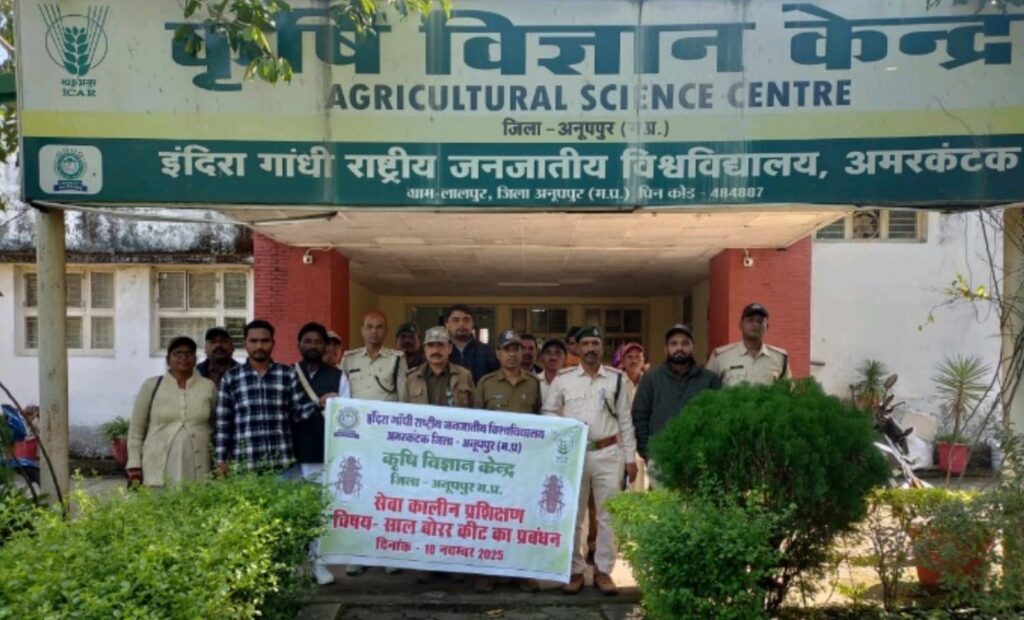 अमरकंटक – मां नर्मदा जी की उद्गम स्थली / पवित्र नगरी अमरकंटक जो मध्य प्रदेश और छत्तीसगढ़ के मध्य स्थित है । यहां के साल वनों में बढ़ते साल बोरर कीट के प्रकोप को देखते हुए कृषि विज्ञान केंद्र इंदिरा गांधी राष्ट्रीय जनजातीय विश्वविद्यालय अमरकंटक द्वारा एक दिवसीय प्रशिक्षण कार्यक्रम का आयोजन किया गया था । यह प्रशिक्षण 10 नवंबर 2025 को संपन्न हुआ जिसमें वन विभाग के क्षेत्रीय अधिकारी , फील्ड स्टाफ , एवं नर्मदा समग्र संस्था के अधिकारी उपस्थित रहे ।