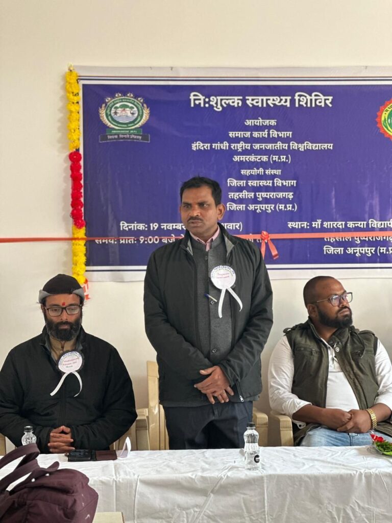 अमरकंटक – मां नर्मदा जी की उद्गम स्थली / पवित्र नगरी अमरकंटक के इंदिरा गांधी राष्ट्रीय जनजातीय विश्वविद्यालय (IGNTU) , अमरकंटक के समाज कार्य विभाग ने 19 नवम्बर 2025 को माँ शारदा कन्या विद्यापीठ , पोंडकी , अनुपपुर जिले में एक चिकित्सा शिविर का आयोजन किया था । इस शिविर का उद्देश्य आसपास की जनजातीय बस्तियों के लोगों को निःशुल्क स्वास्थ्य जाँच और आवश्यक चिकित्सा सेवाएँ प्रदान करना था । यह शिविर पुष्पराजगढ़ तहसील के ब्लॉक चिकित्सा कार्यालय के सहयोग से आयोजित किया गया था , जिसमें पोंडकी , भंडाकोना , कोगा , हर्राटोला और लालपुर सहित आस-पास के गाँवों के कुल 216 लोगों ने स्वास्थ्य सेवाओं का लाभ उठाया ।