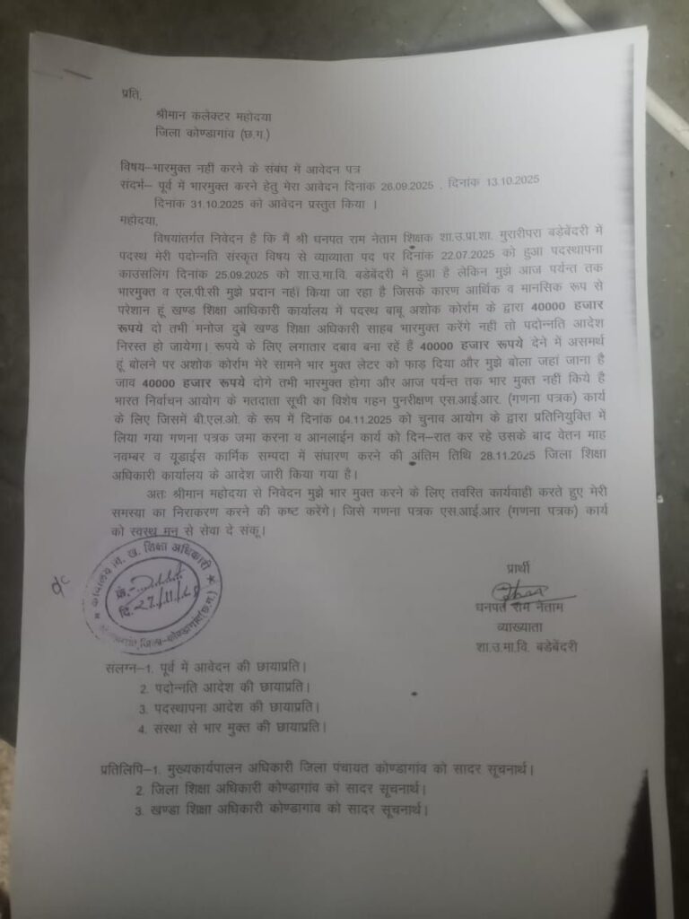 कोंडागांव:- खण्ड शिक्षा अधिकारी कोंडागांव में 15 वर्षो से अधिक स्थापना शाखा में अशोक कोर्राम (सहायक ग्रेड 2) डेरा जमाए हुए है, कलेक्टर कोंडागांव के द्वारा प्रशासनिक स्थानान्तरण शा.उ.मा. वि. मटवाल में किया गया है इसके बावजूद अपने कर्तव्य स्थल में भर ग्रहण नही किया गया है, और 05 माह से बी.ई.ओ. ऑफिस कोंडागांव के कुर्सी में जमे हुए है और वर्तमान में पदोन्नत व्यख्याताओ से एल.पी.सी. देने के एवज में 30-40,000 रुपये की मांग करने की शिकायत प्राप्त हुई है। पिछले 02 माह से व्यख्याताओ को अपने सेवा पुस्तिका के लिए बी.ई.ओ. ऑफिस का चक्कर लगाना पड़ रहा है। इन घूसखोर बाबू के हौसले इतने बुलंद है कि जावो जिस किसी से मिलना है मिलो, मैं किसी से डरता नही ,कहा जाता है। इस बाबू से तंग होकर आर्थिक व मानसिक रूप से पीड़ित होकर कलेक्टर कोंडागांव को शिकायत करनी पड़ी है। वर्तमान में पदोन्नत हुए प्रत्येक शिक्षको से रिश्वत में ली गयी राशि का जांच होनी चाहिए। बाबू की शिकायत कर्ता शिक्षक वर्तमान में बी.एल.ओ.के कार्य में संलग्न है वह आफिस के चक्कर लगाए की चुनाव आयोग की एस.आई.आर.का कार्य करे। इनके कारण वेतन मिलना भी मुश्किल हो गया है। अशोक कोर्राम बाबू के द्वारा विभाग में स्टेशनरी खर्च के नाम पर शिक्षको से कई वर्षों से छोटी मोटी कार्य के एवज में लेन देन करना आमबात है। अब देखना होगा कि शिकायत के बाद उक्त रिश्वत खोर बाबू पर अनुसानात्मक कार्यवाही होगा या विभाग द्वारा सहानुभूति दिखाकर बचाया जाएगा।