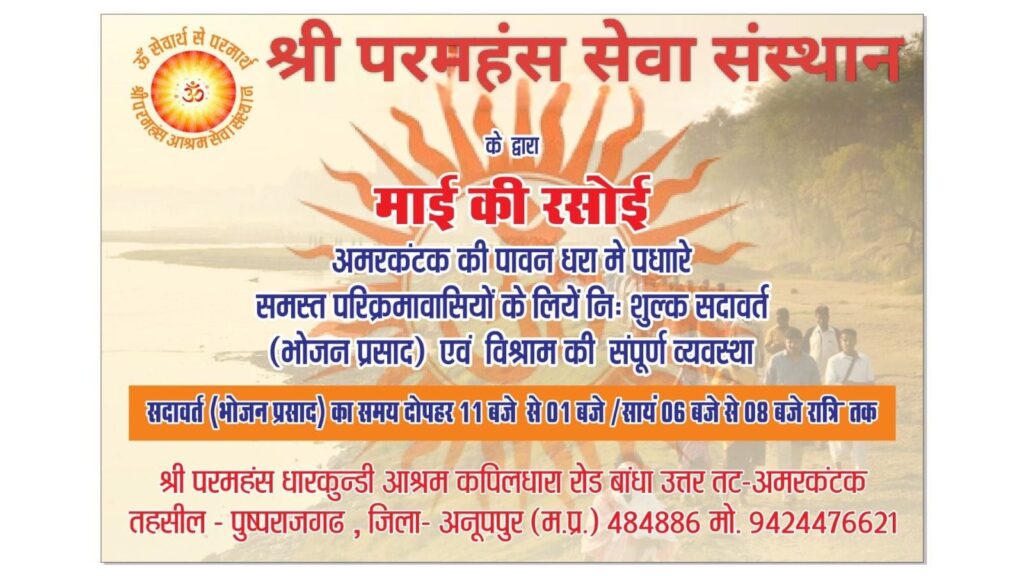 अमरकंटक – मां नर्मदा जी की उद्गम स्थली / पवित्र नगरी अमरकंटक की पावन धरा पर स्थित सेवा भाव से कार्यरत श्री परमहंस आश्रम , धारकुंडी शाखा , अमरकंटक – उत्तर तट , कपिलधारा मार्ग , अमरकंटक जो की मां नर्मदा की गोद में स्थित धारकुंडी आश्रम में लगातार संतो , नर्मदा परिक्रमावासियों और जरूरतमंदों को निरंतर सेवा मां नर्मदा जी  की पावन भूमि अमरकंटक में श्री परमहंस सेवा संस्थान द्वारा संचालित “माई की रसोई” के माध्यम से नर्मदा परिक्रमा करने वाले श्रद्धालुओं की , परिक्रमावासियों को निःशुल्क भोजन एवं रात्रि विश्राम की सुविधाएं आश्रम द्वारा प्रदान की जा रही है । यह योजना  निरंतर उपलब्ध कराई जा रही हैं ।