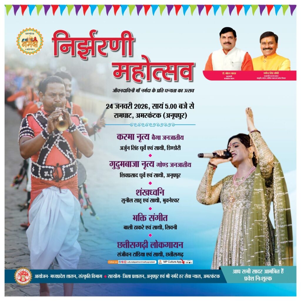 अनूपपुर/अमरकंटक – मां नर्मदा जी की उद्गम स्थली/ पवित्र पावन नगरी अमरकंटक में दो दिवसीय माँ नर्मदा महोत्सव-2026 का आयोजन 24 एवं 25 जनवरी 2026 को होगा । महोत्सव में मध्यप्रदेश शासन संस्कृति विभाग के तत्वाधान में तथा जिला प्रशासन अनूपपुर एवं श्री नर्मदे हर सेवा न्यास अमरकंटक के सहयोग से निर्झरणी महोत्सव का आयोजन 24 जनवरी 2026 को शाम 5 बजे से मां नर्मदा के रामघाट में किया जाएगा ।