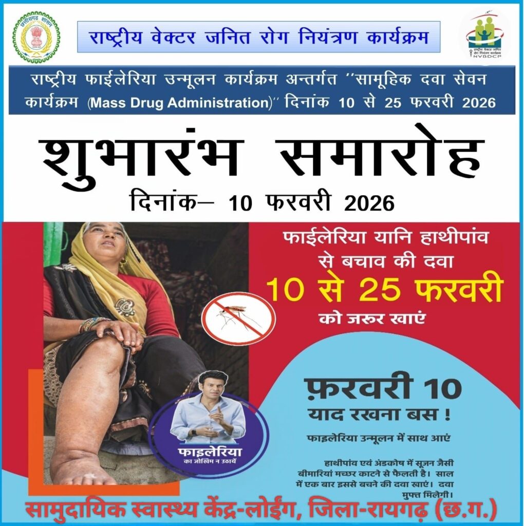 रायगढ़ में फाइलेरिया के विरुद्ध एक मुहिम चलाई जा रही है, जिसके तहत सामूहिक दवा सेवन (MDA) अभियान का शुभारंभ किया गया है। इस अभियान का उद्देश्य फाइलेरिया को पूर्ण रूप से भगाना है और वर्ष 2030 तक इसे उन्मूलन करना है।