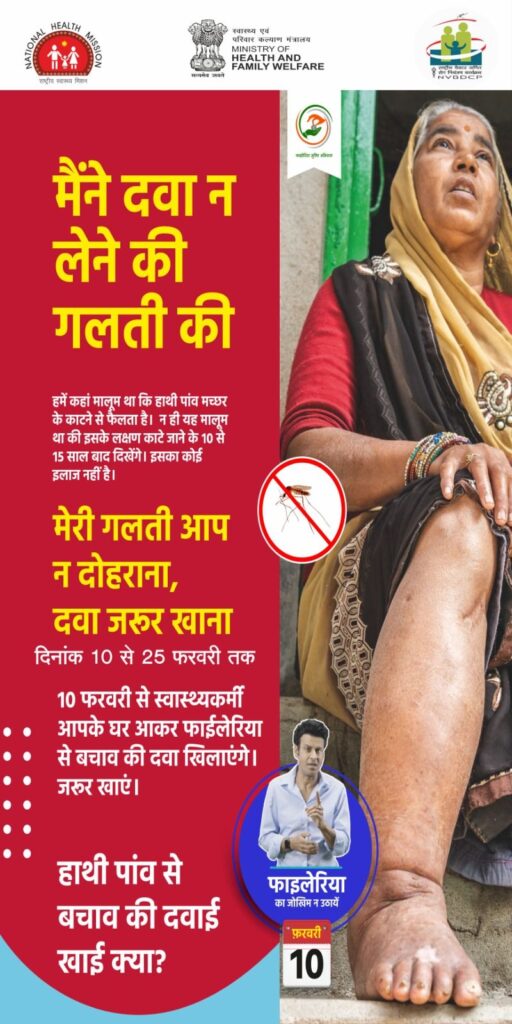 *अपील:* हाथीपांव एक लाइलाज और संक्रामक बीमारी है जो मच्छर के काटने से फैलती है। 2030 तक इसे जड़ से मिटाने के लिए शासन द्वारा दी जा रही मुफ्त दवा का सेवन जरूर करें।