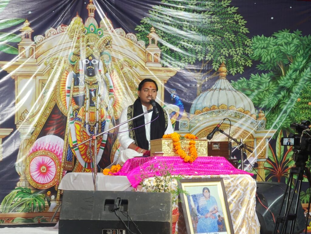 यहां पधारे वृंदावन धाम के सुप्रसिद्ध कथा वाचक पंडित आशुतोष जी महाराज के श्रीमुख से सप्त दिवसीय श्रीमद् भागवत महापुराण की संगीतमय एवं रसपूर्ण कथा का भव्य आयोजन किया जा रहा है । कथा के माध्यम से भगवान श्रीकृष्ण की दिव्य लीलाओं , भक्तों की निष्काम भक्ति और धर्म के गूढ़ आध्यात्मिक सिद्धांतों का भावपूर्ण वर्णन किया जा रहा है जिससे क्षेत्र का वातावरण पूर्णतः भक्तिमय हो रहा है ।