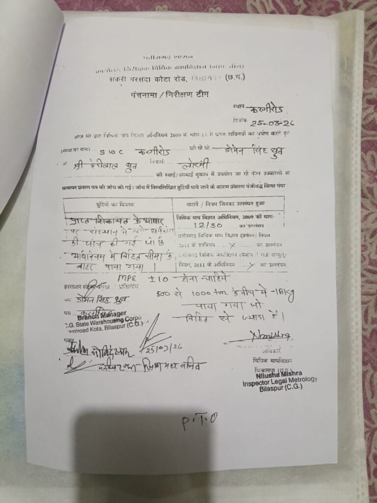 राशन विक्रेताओं ने इसका कारण समझने के लिए नापतौल अधिकारी से लिखित शिकायत की क्योकि बेयरहाउस के धरम कांटा का रहस्य पता चलने लगा था। और धरम कांटा के सत्यापन में नापतौल इंस्पेक्टर ने बारीकी से जांच किया तो धरम कांटा में बड़ी गड़बड़ी मिली इस आसय का पंचनामा बनाकर सील लगाकर नापतौल इंस्पेक्टर ने दुकानदारों के दे दिया।