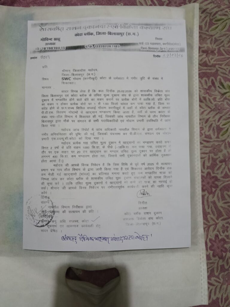 सील कर दिया,गया l कोटा ब्लाक में लगभ 400 कुंटल का हर माह तौल घोटाला वेयरहाउस के धरम कांटा से होता था। इस भरस्टाचार का खुलासा होते ही संबंधित अधिकारी लीपापोती करने में लग गए राशन दुकानदारों ने कोटा एसडीएम सहायक कलेक्टर को ज्ञापन देकर कार्यवाई और इस धोखाधड़ी से दिए गए कम राशन की भरपाई की मांग की तो एसडीएम ने कार्यवाई का आश्वासन दिया है।