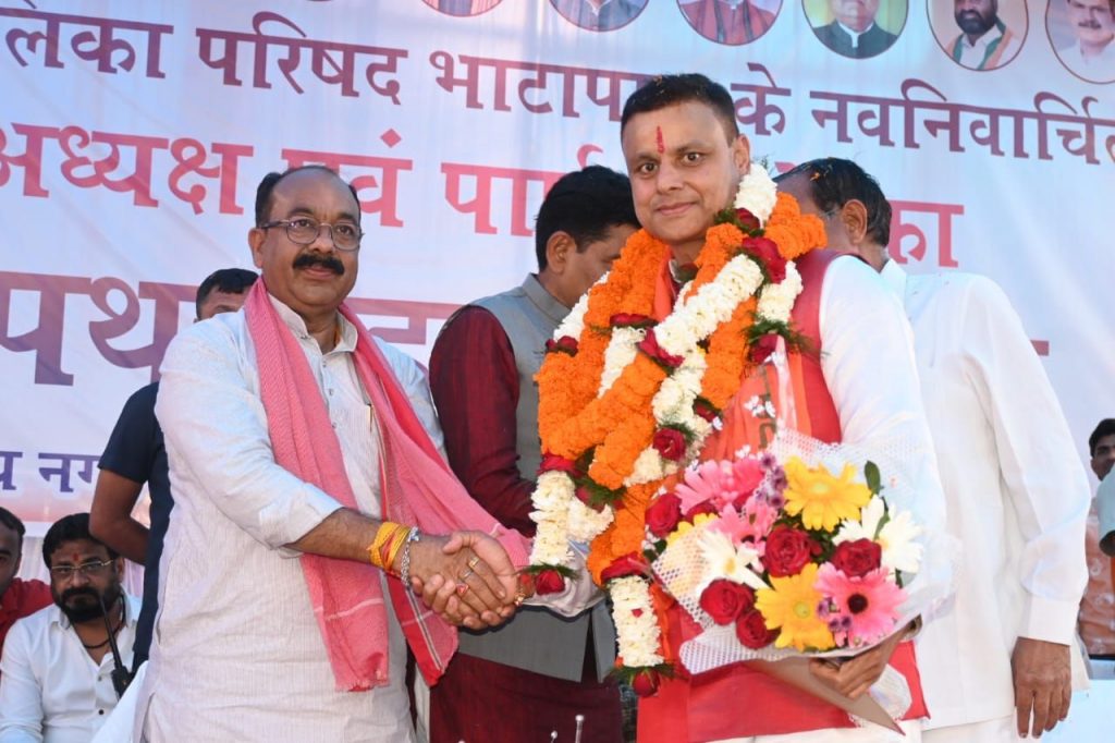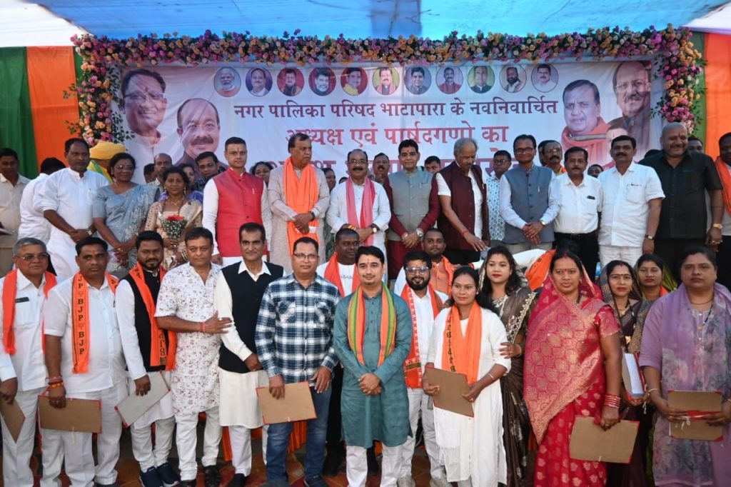 भाटापारा 3 मार्च/ नगरीय निकाय निर्वाचन अंतर्गत नगर पालिका परिषद भाटापारा के नवनिर्वाचित अध्यक्ष और पार्षदों ने सोमवार को उप मुख्यमंत्री अरुण साव के मुख्य आतिथ्य एवं राजस्व मंत्री टंकराम वर्मा व रायपुर सांसद बृजमोहन अग्रवाल की उपस्थिति में शपथ ली। नगर भवन भाटापारा में आयोजित शपथ ग्रहण समारोह में अपर कलेक्टर अभिषेक गुप्ता नें नवनिर्वाचित नगर पालिका अध्यक्ष अश्वनी शर्मा एवं पार्षदों को पद एवं गोपनीयता की शपथ दिलाई इस दौरान नवनिर्वाचित अध्यक्षों और पार्षदों ने उप मुख्यमंत्री से आशीर्वाद प्राप्त किया।