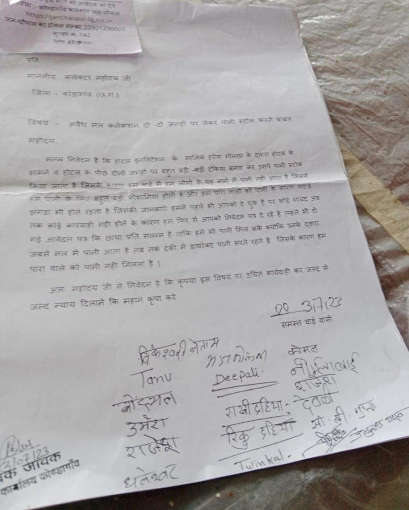 कोंडागांव पानी की समस्या के लिए अस्पताल वार्ड वासियों ने जनदर्शन में हस्ताक्षर कर आवेदन दिया था जिस पर जन दर्शन अधिकारी कोंडागांव कलेक्टर दीपक सोनी सर ने नगर पालिका कोंडागांव सीएमओ रहे दिनेश डे को तत्काल समस्या का समाधान करने का निर्देश दिया पर सीएमओ की लापरवाही के कारण आज तक पानी की समस्या का समाधान नहीं किया गया जबकि कुछ ही महा बाद चुनाव होने वाला है और सरकार छोटी सी छोटी समस्या का भी तत्काल समाधान कर रही है पर इन लापरवाही अधिकारि सीएमओ दिनेश डे के कारण अस्पताल वार्ड वासी गर्मी के साथ-साथ अब भारी बरसात में भी पानी के लिए तरस रहे हैं जबकि इस वार्ड में भूतपूर्व सांसद स्वर्गीय मांकू राम जी भूतपूर्व विधायक स्वर्गी मंगल राम जी भूतपूर्व मंत्री व अपेक्स बैंक के डायरेक्टर शंकरसोढ़ी जी भूतपूर्व मंत्री व राष्ट्रीय उपाध्यक्ष सु श्री लता उसेंडी जी का निवास भी इसी वार्ड में है जबकि घरों पर नल कनेक्शन नल जल योजना के तहत लिया गया है सन 21 से नलों में पानी नहीं आने के बावजूद भी नगर पालिका के द्वारा नल जल का पैसा भी लिया जा रहा है वार्ड वासियों को मजबूरन टैंकर का पानी पीना पड़ रहा है वह दैनिक उपयोग के लिए टैंकर से पानी भरना पड़ता है लगभग या सिलसिला 2 वर्ष से चल रहा है जब भी नगरपालिका में शिकायत करते थे तो उनका कहना था कि बोर मैं पानी नहीं है नया बोर करना पड़ेगा पर जब वार्ड वासियों को पता चला कि बोर में पानी है लेकिन इनविटेशन होटल वालों को दो कनेक्शन दिया गया है जिससे वह बड़ी-बड़ी टंकी बनाकर पानी स्टोर करते हैं जिसके कारण वार्ड वासियों