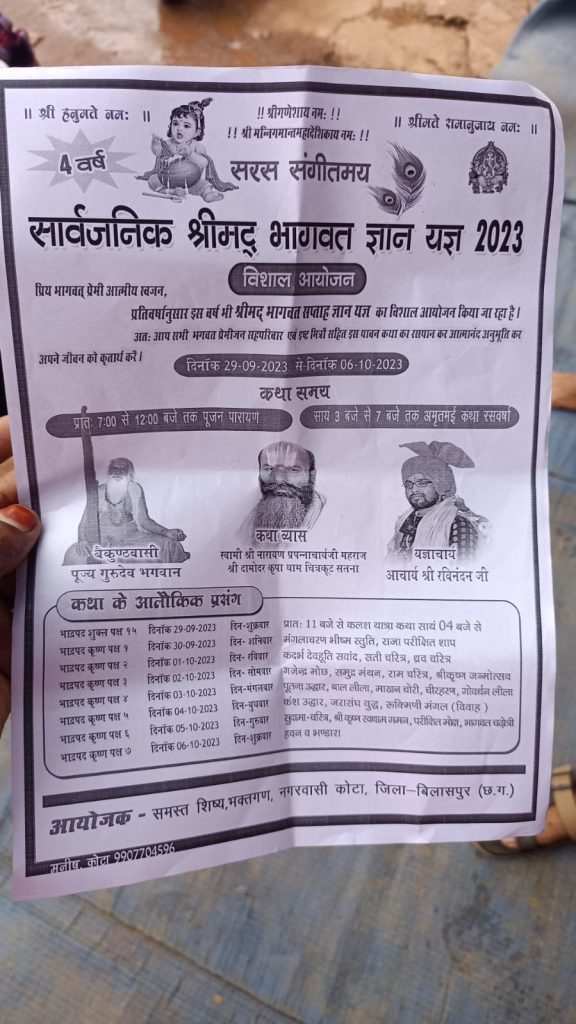 करगीरोड ( कोटा) सार्वजनिक श्रीमद् भागवत कथा ज्ञान यज्ञ सात दिवसीय कोटा नगर के डाकबंगला में कथा व्यास स्वामी श्री नारायण प्रपन्नाचार्यजी महराजजी, यज्ञाचार्य आचार्य श्री रविनंदन, श्री दामोदर धाम चित्रकूट सतना वाले के श्रीमुख से प्रतिदिन शुक्रवार 29 से 6शुक्रवार तक प्रातः काल 7बजे तक पूजन पारायण,कथा सायं 3बजे से 7तक रसवर्षा होगा आयोजन समिति सभी नगरवासियों का दान सहयोग प्राप्त हुआ है।