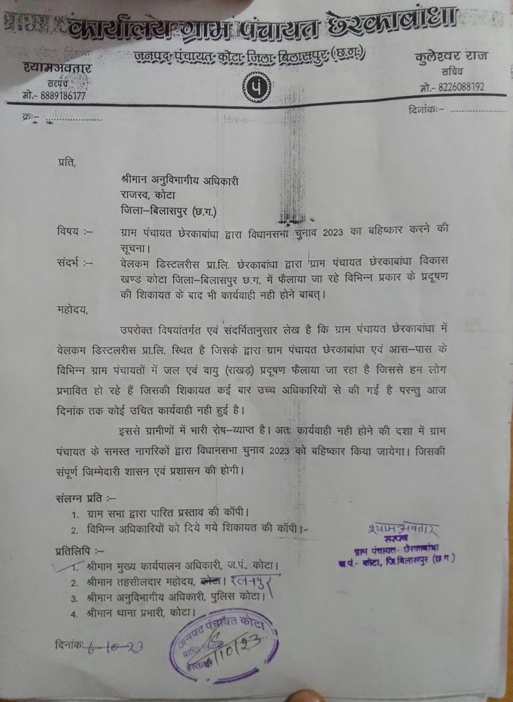 * ग्लोबल न्यूज़**करगीरोड ग्राम पंचायत छेरकाबांधा के ग्रामीणों की समस्या हल होने की वजाय दिन प्रतिदिन बढ़ती जा रही है वेलकम प्राइवेट डिस्टलरी प्राइवेट लिमिटेड फैक्ट्री के द्वारा जहरीला गंदा पानी आसपास के क्षेत्र को एवं खेतिहर जमीन को बंजर प्रदूषित कर रहा है यहां पर कई किसानों के खेत की फसल भी जल गई है फैक्ट्री के द्वारा उन्हें मुआवजा भी नहीं दिया जा रहा है एवं फैक्ट्री से निकलने वाले धुवां से ग्रामीण परेशान हो रहे हैं एवं गंदी बदबू के कारण रहना दुबर हो गया है हमारे ग्राम पंचायत के छोटे-छोटे बच्चे पढ़ने जाते हैं जो बदबू की वजह से बीमार पड़ रहे हैं आसपास क्षेत्र में गंदा जहरीला पानी की वजह से हर वर्ष पशु पक्षी भी मर रहे हैं ग्रामीणों ने ग्राम पंचायत में ग्राम सभा का प्रस्ताव पारित किया गया कि अगर उक्त फैक्ट्री के खिलाफ शासन प्रशासन के द्वारा कार्रवाई नहीं की जाती है तो हम सभी समस्त ग्रामवासी विधानसभा चुनाव 2023 का बहिष्कार करेंगे जिसकी समस्त जवाबदारी शासन प्रशासन की होगी उक्त बैठक में सरपंच उप सरपंच सचिव एवं ग्राम पंचायत छेरकाबांधा के समस्त ग्रामवासी उपस्थित थे उन्होंने प्रशासन के ऊपर आरोप लगाया कि कई बार शिकायत करने के बाद भी आज तक कोई भी ठोस कार्यवाही नहीं की गई जिसकी शिकायत को लेकर सरपंच एवं ग्राम वासियों ने अनुविभागीय अधिकारी राजस्व को आज एक ज्ञापन सौंपा। सरपंच श्याम अवतार ने बताया कि हम लोग ग्राम सभा की बैठक करके प्रस्ताव पारित किए हैं कि इस वर्ष चुनाव2023 का बहिष्कार किया जाएगा इस संबंध में एक ज्ञापन आज हमने एसडीएम साहब कोटा को सौप है