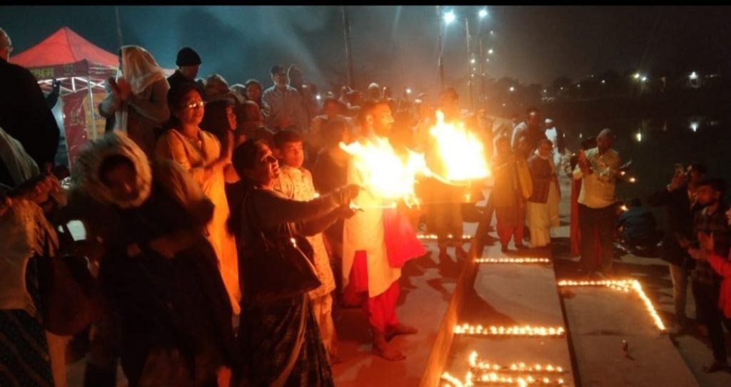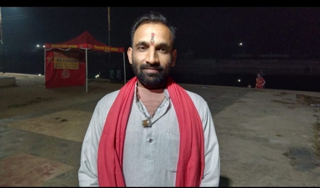 आकाश द्विवेदी नर्मदा जी के तट रामघाट में लगभग पांच वर्ष से रोजाना सायं काल महा आरती करते आ रहे है