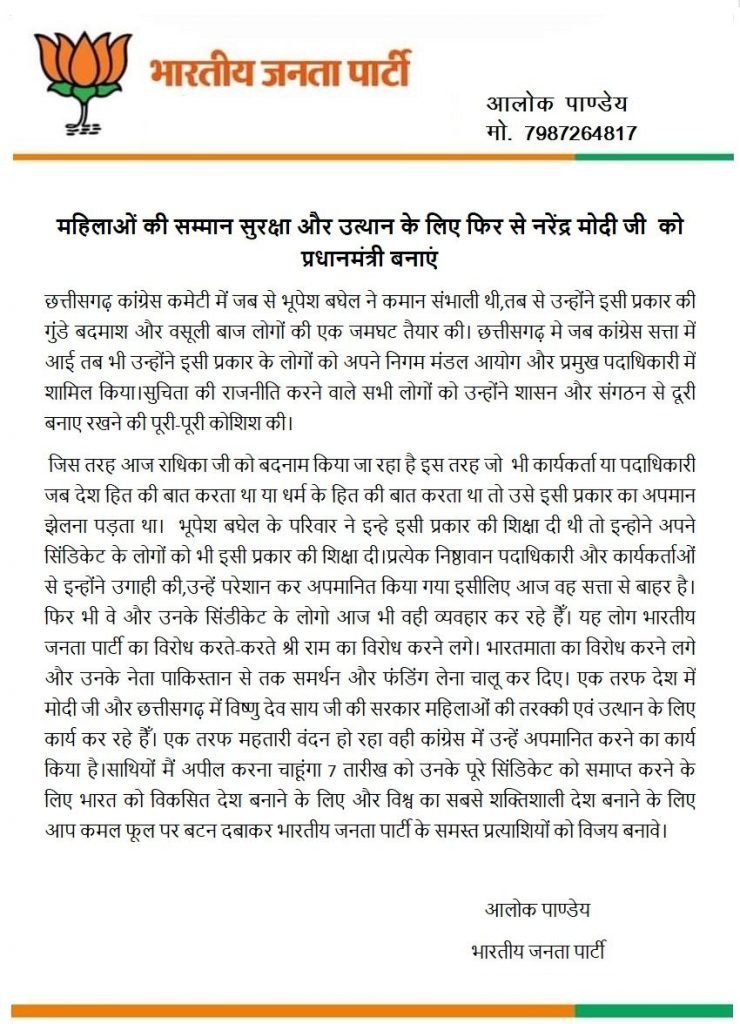जिस तरह आज राधिका जी को बदनाम किया जा रहा है इस तरह जो भी कार्यकर्ता या पदाधिकारी जब देश हित की बात करता था या धर्म के हित की बात करता था तो उसे इसी प्रकार का अपमान झेलना पड़ता था। भूपेश बघेल के परिवार ने इन्हे इसी प्रकार की शिक्षा दी थी तो इन्होने अपने सिंडिकेट के लोगों को भी इसी प्रकार की शिक्षा दी।प्रत्येक निष्ठावान पदाधिकारी और कार्यकर्ताओं से इन्होंने उगाही की,उन्हें परेशान कर अपमानित किया गया इसीलिए आज वह सत्ता से बाहर है। फिर भी वे और उनके सिंडीकेट के लोगो आज भी वही व्यवहार कर रहे हैँ।यह लोग भारतीय जनता पार्टी का विरोध करते-करते श्री राम का विरोध करने लगे। भारतमाता का विरोध करने लगे और उनके नेता पाकिस्तान से तक समर्थन और फंडिंग लेना चालू कर दिए।एक तरफ देश में मोदी जी और छत्तीसगढ़ में विष्णु देव साय जी की सरकार महिलाओं की तरक्की एवं उत्थान के लिए कार्य कर रहे हैँ। एक तरफ महतारी वंदन हो रहा वही कांग्रेस में उन्हें अपमानित करने का कार्य किया है।साथियों मैं अपील करना चाहूंगा 7 तारीख को