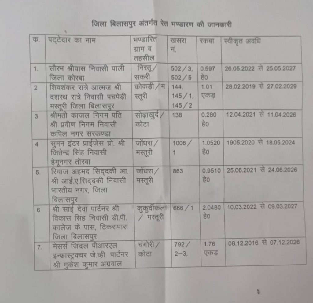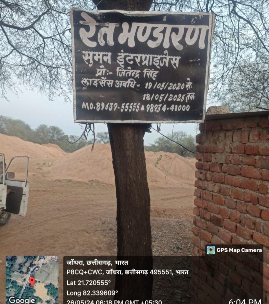 बिलासपुर, 27 मई 2024/कलेक्टर के निर्देश पर खनि अमला बिलासपुर द्वारा गत दिनों ग्राम जोंधरा तहसील मस्तूरी में खनिज रेत के भंडारण का मौका जांच किया गया। मौका जांच मेंअशोक कर्ष निवासी अकलतरा द्वारा लगभग 120 हाईवा/1440 घन मीटर रेत भंडारित होना पाया गया। इसी डकार मेसर्स सुमन इंटरप्राइजेज केप्रो. जितेंद्र सिंह को स्वीकृत भंडारण अनुज्ञप्ति क्षेत्र में लगभग 200 हाईवा/2400 घन मीटर रेत भंडारित होना पाया गया।