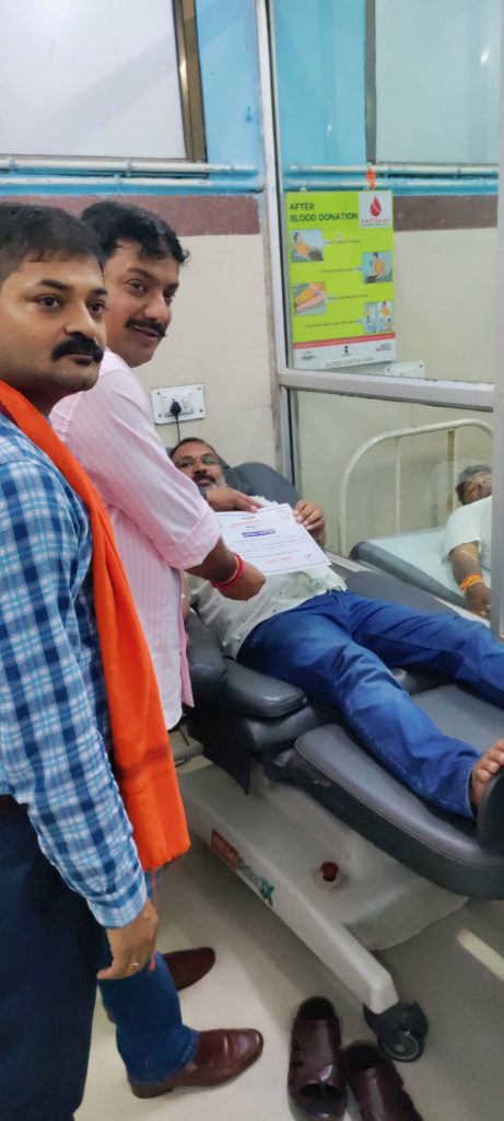*बिलासपुर ग्लोबल न्यूज़ ब्यूरो*समाचार भारत के प्रधानमंत्री नरेंद्र मोदी के जन्म दिवस पर विशाल रक्तदान शिविर का आयोजन बिलासपुर सिम्स में किया गया भाजपा के बेलतरा विधायक सुशांत शुक्ला के साथ भाजपा पदाधिकारी एवं कार्यकर्ताओं के द्वारा लगभग 200 लोगों ने रक्तदान देकर गरीब के जीवन में सहयोग मिल सके इस भावना से रक्तदान दिया गया कभी-कभी रक्त ना मिलने के कारण सैकड़ो लोगों की मौत हो जाती है इसको देखते हुए भाजपा के कार्यकर्ताओं ने नरेंद्र मोदी प्रधानमंत्रीके जन्म दिवस पर रक्तदान किया एवं सिम्स के द्वारा रक्त डोनेट करने वालों को प्रमाण पत्र भी दिया गया एवं फल वितरण का भी कार्यक्रम किया गया उच्च कार्यक्रम में भाजपा के भाजपा विधायक सुशांत शुक्ला निखिल केशरवानी मोहित जायसवाल विकास सिंह ठाकुर सुमंत सिंह मनीष कौशिक नेम सोनी एवं समस्त भाजपा पदाधिकारी एवं कार्यकर्ता उपस्थित थे।
