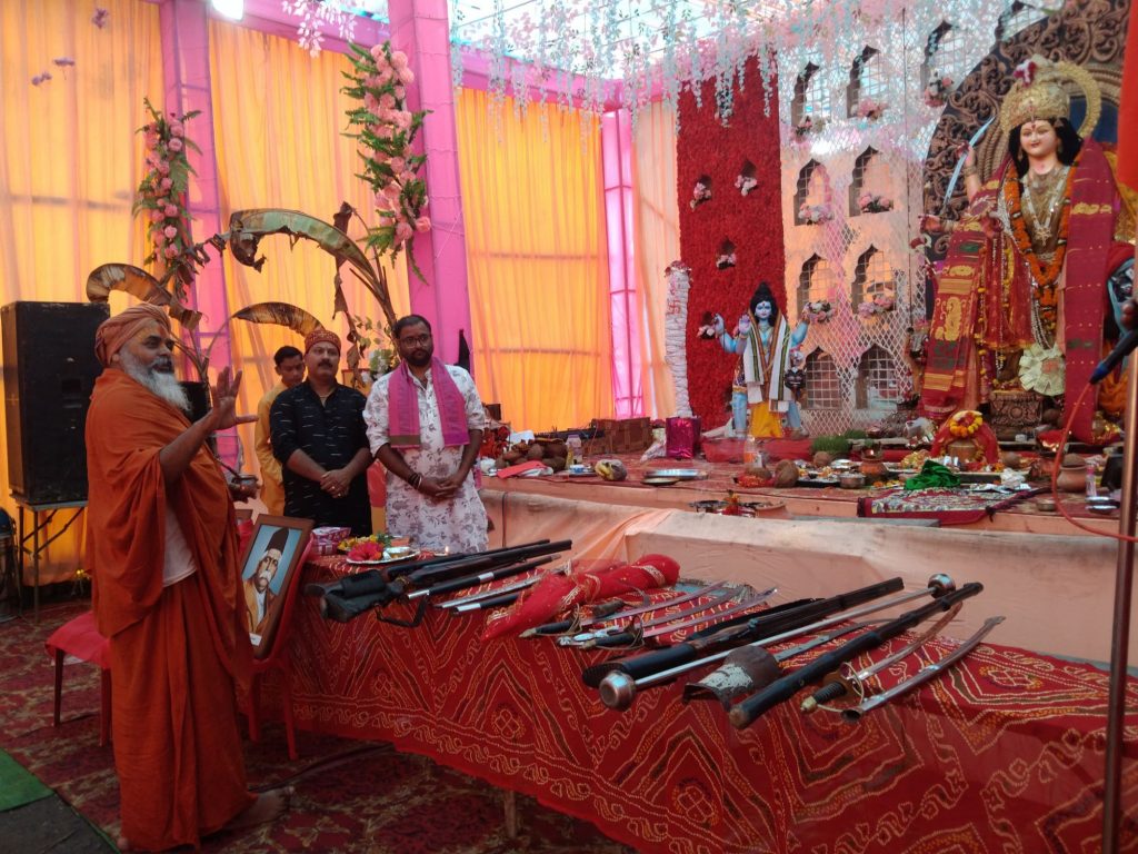 विजया दशमी के पावन पर्व पर राष्ट्रीय स्वयं सेवक संघ बंधुओ के तत्वाधान में प्राधिकरण पास विराजी मां भगवती शक्ति दुर्गा समक्ष श्रीमहंत स्वामी राम भूषण दास जी महाराज के मुख्य अतिथि की उपस्थिति में शस्त्र पूजन पंडित धनेश द्विवेदी (वंदे महाराज) जो मुख्य वक्ता थे ने विधि विधान मंत्रोच्चार द्वारा शस्त्र पूजन कराया । पूजन में उपस्थित खंड कार्यवाह दिनेश साहू , नगर कार्यवाह रंजीत सिंह (नंदू) , खंड व्यवस्थापक प्रमुख ओम प्रकाश अग्रवाल तथा स्वयं सेवक बंधु , नगरवासी सम्मिलित हुए । इस पूजन के बाद मुख्य अतिथि और मुख्य वक्ता ने शस्त्र पूजन से संबंधित अपने अपने वक्तव्य दे संबोधित किया । स्वामी रामभूषण दास जी महाराज ने कहा की हर घर में शास्त्र रखना जरूरी है और रखना भी चाहिए उसी तरह शस्त्र भी अति आवश्यक है । यह परंपरा पीढ़ी दर पीढ़ी चली आ रही है जिसकी आज विजया दशमी तिथि को हम सब अपने अपने अस्त्र शस्त्र की पूजन करते है ।