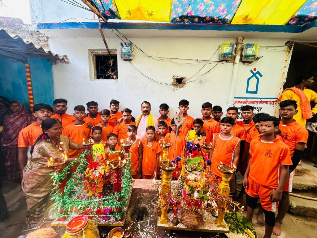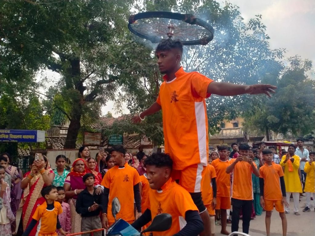 भाटापारा4 नवंबर/ गौरा गौरी शोभायात्रा में बजरंग सेना अखाड़ा दल के बाल कलाकारों ने दिखाया हैरतअंगेज करतब । नगर में दीपोत्सव पर्व बड़े धूमधाम से हर्षोल्लास के साथ मनाया गया । भगवान गौरा-गौरी मूर्ति की स्थापना नगर के अधिकांश वार्डो में जैसे ,नयापारा वार्ड, डबरा पारा,नया गंज वार्ड, हथनिपारा वार्ड, सुभाष वार्ड ,शक्ति वार्ड ,नेहरू वार्ड, मातादेवालय वार्ड सहित अनेक वार्डों में किया गया, जहां पर भगवान गौरा गौरी की विधिवत पूजा अर्चना आदिवासी समाज सहित सभी समाज के लोगों ने किया। धनतेरस के दिवस पर गौरा-गौरी स्थापना फूल कूचरना का कार्यक्रम संपन्न किया गया है लक्ष्मी पूजन पर प्रात 10:00 बजे संबंधित स्थल से भगवान गौरा गौरी की मूर्ति हेतु चुलमाटी कार्यक्रम संपन्न किया गया एवं निर्धारित स्थल पर ले जाकर भगवान गौरा गौरी की मूर्ति संबंधित बैगाओ के द्वारा बनाई गई तथा रात्रि में भगवान गौरा गौरी विधिवत वैवाहिक कार्यक्रम संपन्न हुआ। गोवर्धन पूजा के दिन प्रात 6:00 बजे टिकावन कार्यक्रम संपन्न हुआ एवँ दोपहर 12:00 बजे भगवान गौरा-गौरी की भव्य शोभायात्रा गाजे बाजे व अखाड़े के साथ विसर्जन कार्यक्रम स्थानीय कल्याण सागर तालाब में संपन्न किया गया इसी तात्पर्य में नयापारा वार्ड, धरमु गली गौरा चौरा पर ईश्वर राजा-गौरा रानी की मूर्ति स्थापित सतरूपा गणेश सिंह ध्रुव, सावित्री पुनऊराम ध्रुव,कदम सुरेश सिंह ध्रुव, जयसिंह कुंती ध्रुव, इंदु गीता प्रसाद ध्रुव,दिनेश बिमला ध्रुव, प्रीति ओमसिंह ध्रुव, रामायण संतोषी ध्रुव,नेहा प्रेम ध्रुव के देखरेख में जसपाल , दीक्षा, रश्मि, लक्ष्मी, आरती, जानकी, गौरी ,कोमल, निकिता ध्रुव के द्वारा संपन्न किया । इसमें आदिवासी परिवार सहित वार्ड वासियों के सहयोग से यह कार्यक्रम हर्षोल्लास के साथ संपन्न हुआ। इस कार्यक्रम में प्रमुख रूप से सहभागिता बजरंग सेना अखाड़ा दल के प्रमुख बजरंग ध्रुव के मार्गदर्शन में छोटे-छोटे कलाकारों द्वारा बॉबी ध्रुव, सन्नी ध्रुव,शिवम ध्रुव, पप्पू पवनकर, चिंटू यादव, पिंटू यादव, डगेश्वर साहू, सौरभ ध्रुव, मोनू यादव, जिगर, ध्रुव, प्रथम, ध्रुव, शेखर ध्रुव, निक्कू, हितेश, जतिन, साहित्य, विकास, मयंक, नैतिक, भूपेंद्र, कृष्णा, लकी सहित अन्य आकर्षण हैरत अंगेज करतब दिखाए। कार्यक्रम को सफल बनाने में सहयोग हिमांशु यादव, शिव ध्रुव, गोलू ध्रुव, आयुष यादव, निखिल यादव अमन ध्रुव, जंतु ध्रुव, आदि ने शोभायात्रा में सिर पर गौरा-गौरी की प्रतिमाओं को रखें युवतियां। शोभायात्रा में अखाड़े के युवाओं ने आकर्षक हैरत अंगेज कर देने वाले करतब दिखाएं।